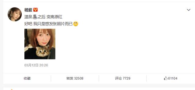 杨紫泡温泉晒素颜自拍照,火红小苹果脸惹人爱