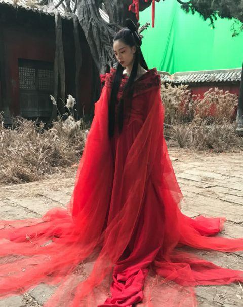钟楚曦在片场的时候真的很随意了,但拍戏的时候又很认真,她的裙子是很长的,还好她本人的身材是很高挑的,所以穿上去很适合,搭配一个很特别的妆容,显得她整个人很冷艳,超级适合她。