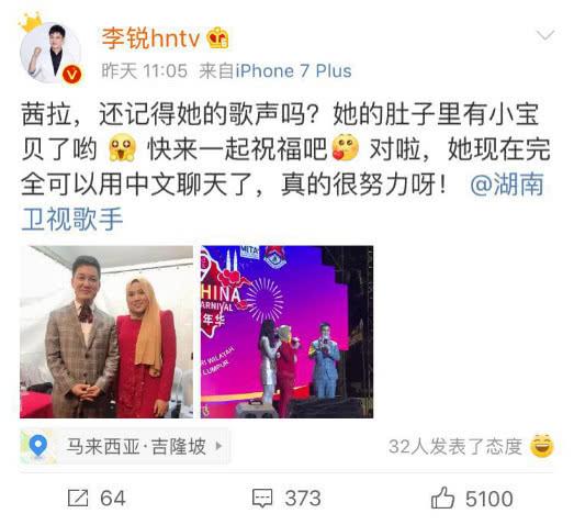 还记得茜拉吗?没错,就是那位拥有天籁之音的马来西亚女歌手,也参加过《我是歌手》第二季,很多人都为她的歌声所倾倒。2月17日,主持人李锐在微博中发布一则消息,宣布茜拉怀孕,称她“肚子里有了小宝贝了哟,快来一起祝福吧”。