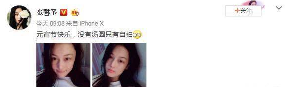 2月19日元宵节,在家安心养胎的张馨予一大早就在社交平台晒出美照给大家送上节日祝福,或许是怀孕,张馨予表示今年的元宵节只有自拍没有汤圆。听上去还是有那么点小失落,不过粉丝都贴心,纷纷留言表示:“有自拍就够了!”