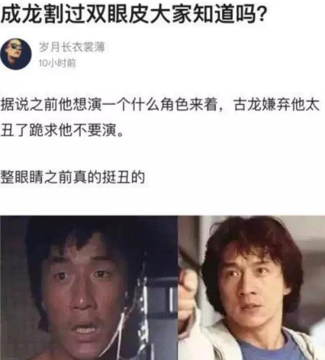 在成龙割双眼皮之前,古龙曾直言说他丑,于是没有把成龙想要饰演的角色给他。后来因为眼角受伤,顺便割了个双眼皮的成龙颜值忽然提升,身价也跟着涨了,事业由此走上上坡路。