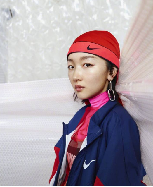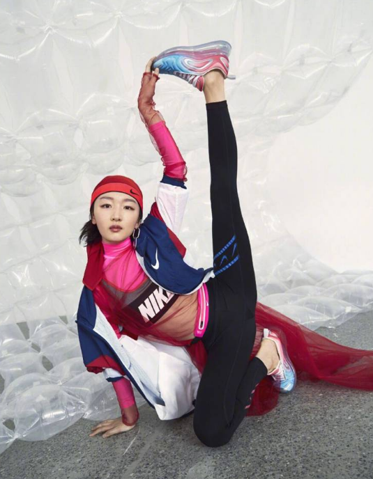 或许是为了突出运动风的特点,周冬雨还做了抬腿弯腰的动作,这个动作的设计也是让人非常无奈了。虽然这个动作没有什么美感,但是看着周冬雨忧郁的眼神,总算有点大片感了。周冬雨的骨架瘦弱纤细,搭配这种奇葩造型倒是有些俏皮可爱。