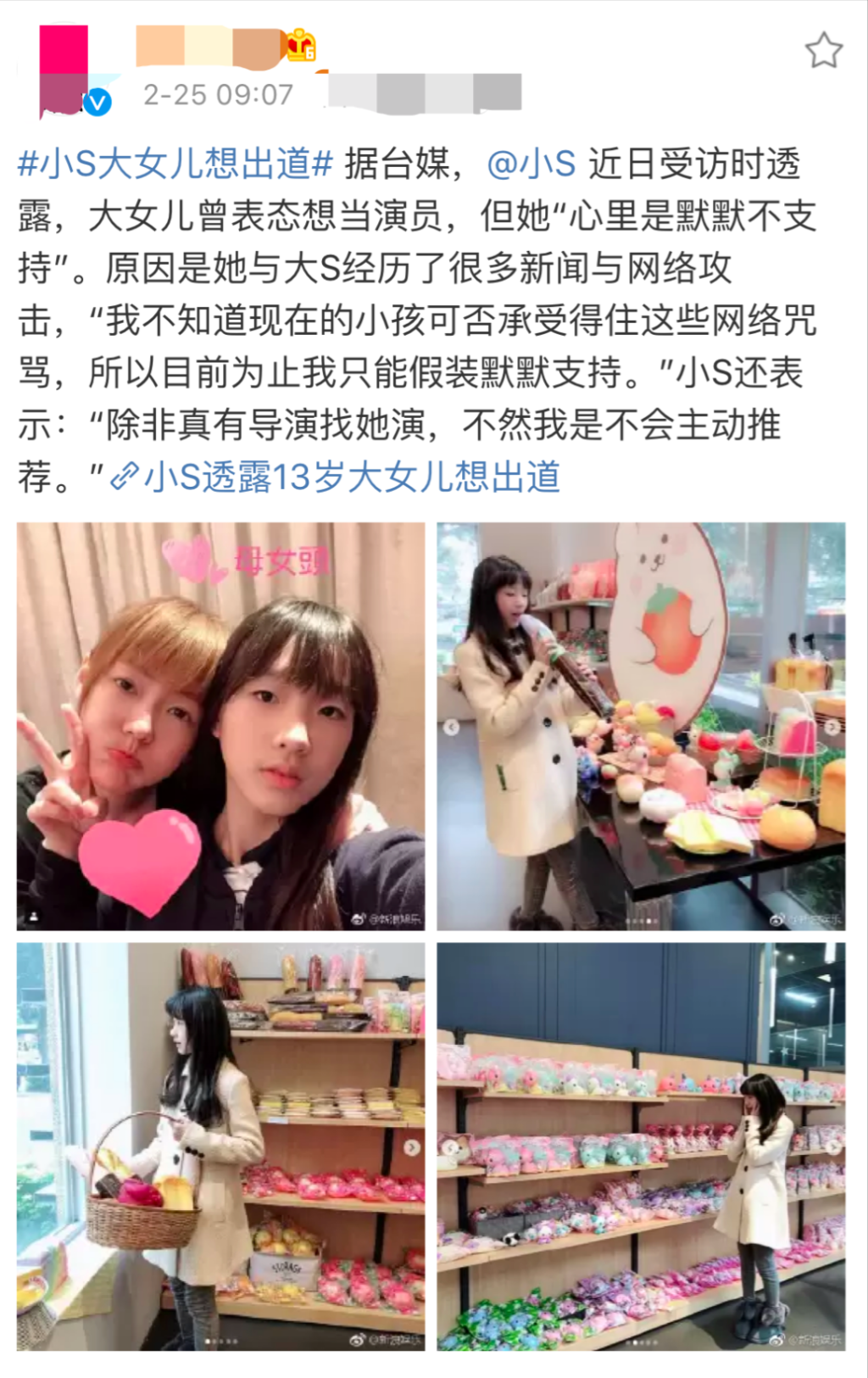 近日,小S就透露出了13岁大女儿出道的消息,对于女儿想出道一事,小S也是大方地分享到自己的一些想法。