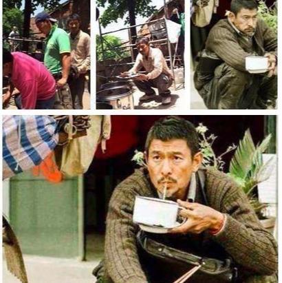 刘德华更是蹲在地上等着盛饭,丝毫没有一点大牌的样子,低调有实力,活该火一辈子!而且他的样子可以说是最接近地气的了。也是最入戏的。