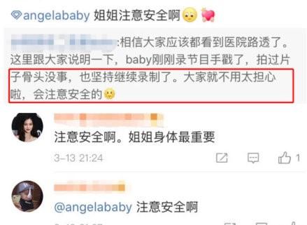 之后有知情者站出表示:“baby刚刚录制节目手戳了,拍过片子骨头没事,也坚持继续录制了”,原来baby顶着受伤的手将节目录制完才去就医,粉丝都纷纷留言:“注意安全啊!”。