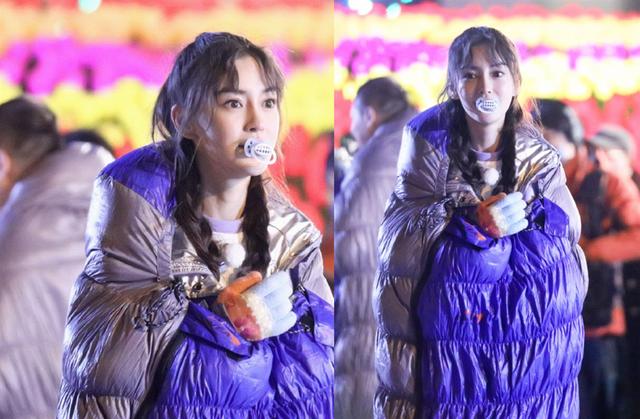 baby中间一度被冻到有些呆萌,目光呆滞,脑子此刻应该已经放空,全身只能感受到寒冷,仔细看都能看到她冻到发白的面容,不知道口中的奶嘴是录制节目时的道具还是她的取暖工具呢?