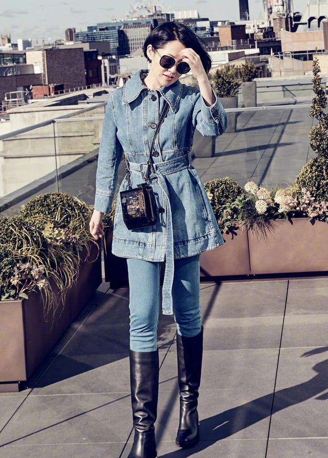 许晴不但在银屏上显得年轻漂亮,私服搭配也是很显年轻,哪怕是已经五十岁,可是依旧保留着漂亮的气质,成为大众心目中的不老女神。一件长款牛仔外套,腰间系上腰带,秀出小蛮腰,下穿一条紧身牛仔裤,搭配黑色高筒皮靴,一对大长腿轻松显出来!