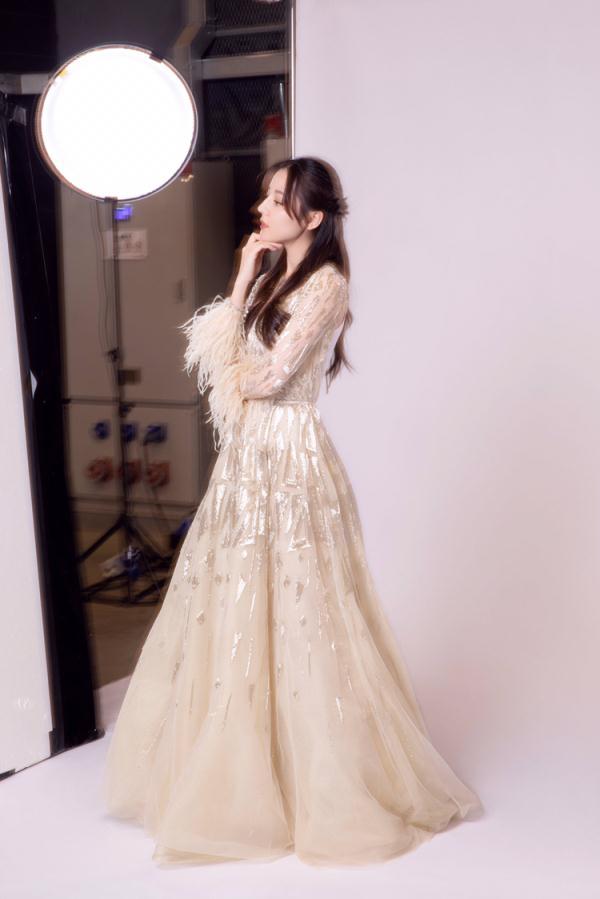 全身照很惊艳,长长的裙摆拖地,真是仿佛中世纪城堡里的优雅公主,乳白色的长裙美出了梦幻般的色彩,闪闪发光,整个人都笼罩在一种梦境中,热巴你也太美了,连女孩子都要爱上你了。