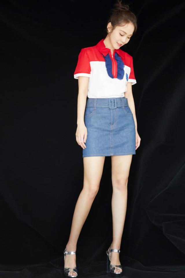 张佳宁身穿一件红白蓝撞色拼接上衣,清新简约又很有学生气,搭配浅蓝色牛仔裤,脚踩一双银色 高跟鞋,将上衣束在裙子里,系上同色系的腰线,提高腰线,拉长身材比例,轻松凹出逆天大长腿,让人好生羡慕!
