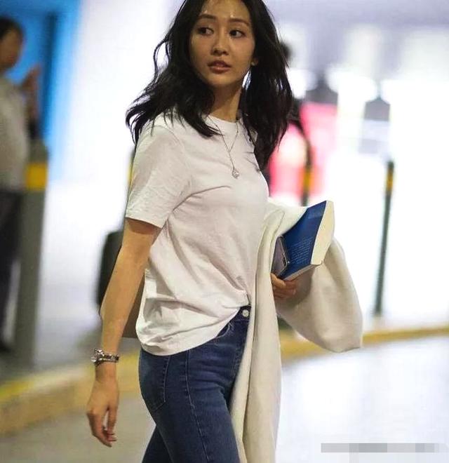 她这次走的是亲民路线吗?身上的穿搭也非常的路人啊,上半身就只是一件非常简单的白色印花T恤,下半身穿了一条牛仔长裤,她这样穿是让她的腿看上去像大象腿。小腹的肉都给凸出了。