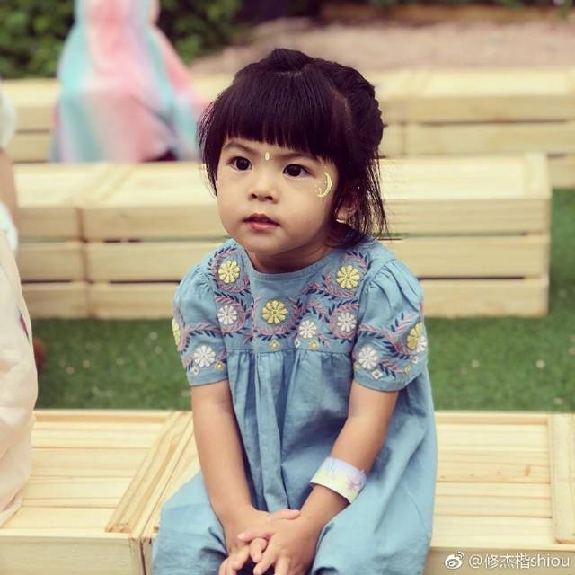 BO妞近照,五官精致,大眼睛比姐姐的还漂亮,头发虽然有些乱,但是却无法掩盖她身上精灵般的气质,穿着带有波西米亚风的裙子,静静地坐在那稚嫩的小脸上带着俏皮的神情,估计爸爸都被女儿美到了吧。