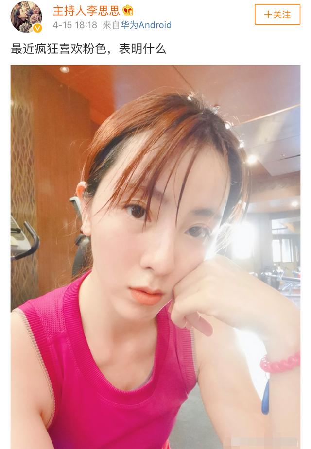 近日,李思思在其社交平台晒出自拍照,并配文发问“最近疯狂喜欢粉色,表明什么”。这一动态飞快引起了粉丝和吃瓜群众的讨论。照片中,李思思穿着粉色运动背心,头发湿漉漉的,看起来似乎是刚刚运动完。