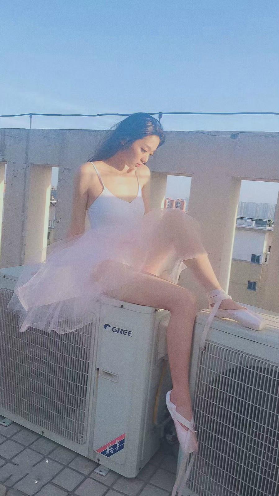 这是张兆艺穿着芭蕾服的样子,虽然坐在空调外机的顶上,但是她的模样看起来,很优雅,白色的上衣,粉色的蕾丝裙,让她的气质显得很清灵,就像是一个画中的公主,而且长发披散在脑后的样子,也是女神范十足,加上她这精致的五官,真的是很吸引人眼球了。