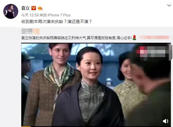 3月31日,中午袁立发文表示“收到了剧本再演宋庆龄?演还是不演?”似乎在征询网友和粉丝们的意见。