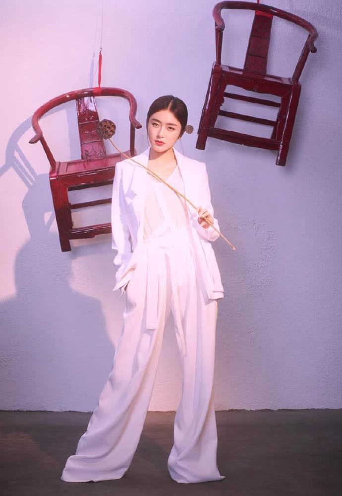 再看秦岚的这身白色look十足酷帅了。秦岚秀发中分,全部扎起,一抹红唇尽显优雅迷人。再看一件宽松的连衣裤穿起来十足有范了,在搭配一件白色的西服外套 ,更显干练帅气!
