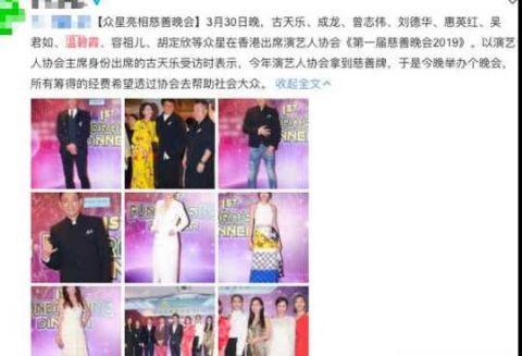3月30号晚,2019年香港第一届慈善晚会正式开办,会长正是在内地捐献了100多所学校的古天乐,当天晚上大咖云集,来了大半个香港娱乐圈,有不少男神刘德华,功夫巨星成龙,香港名嘴曾志伟等,女明星有号称不老女神的温碧霞,喜剧人吴君如。