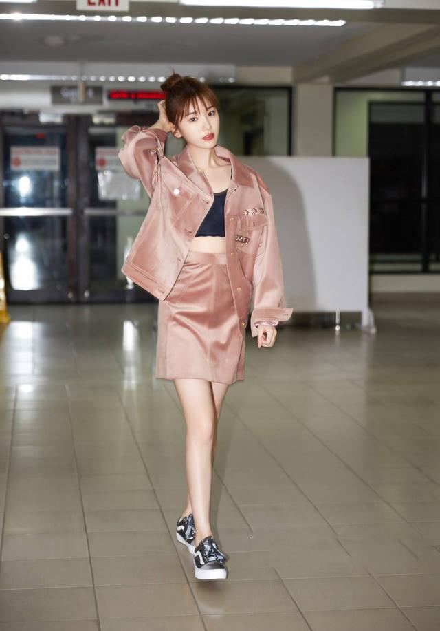 这绸缎的亮片休闲套装,内搭上黑色抹胸,露纤细的小蛮腰,休闲随性又显得穿搭很质感,扎着高高的丸子头和轻薄的刘海,完全露出了她很有灵气的一面,很气质又很显穿搭的时尚和品味,脚踩黑色的厚底鞋,这一双又细又直的双腿也是显得特别耀眼,可以说这个最美四月天里最值得我借鉴的少女减龄穿搭。