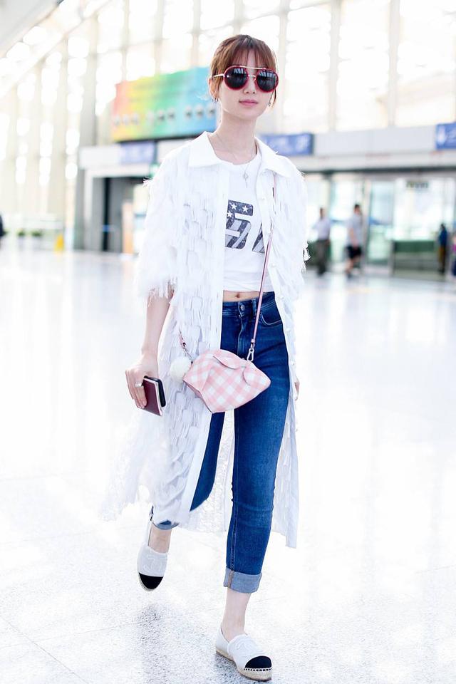 轻盈的白色衬衫,内搭露脐的白色印花T恤,看起来清新减龄特别有活力,对于穿出少女感,对衣服的颜色自然也是要清新靓丽一点,看毛晓彤的这身搭配就恰到好处,下半身搭配蓝色牛仔裤,终于不穿厚底鞋的毛晓彤,就算身高仅有163的她,这看起来也是一点不显矮小。