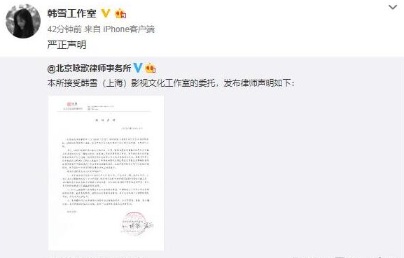 要说韩雪如果因身体不适,应该由B角顶替,但却跟官方选择了“假唱”这条最错的决定;哪怕是时候韩雪和工作室承诺或道歉,对于她的名誉和影响绝不仅仅是退票这么简单;随着事件热度上升,韩雪也是第一时间发布律师声明,而对于某些网络停止散播不实言论,并立即删除相应内容,停止侵权。谁知,在4月24日,官博检察日报却在成了第一个当面批评批韩雪假唱的媒体,并配文道:假唱说成完美,刷新行业下限;更是在文章中说道:有绑架观众的嫌疑!由此可见,韩雪的道歉声明并不能得到观众的认可,乃至官媒的认可;尤其是近些年官方对艺人的自身要求,而对于一个知名人物,却公然挑战“假唱”行为,而这种行为也绝非不是感冒或者家人生病为理由,因为本身这是错误的行为!而这将成为韩雪演艺生涯的第一个低谷,毕竟出道多年,她的背景和能力也一直备受圈内关注,可以说是令人瞩目的明星之一!