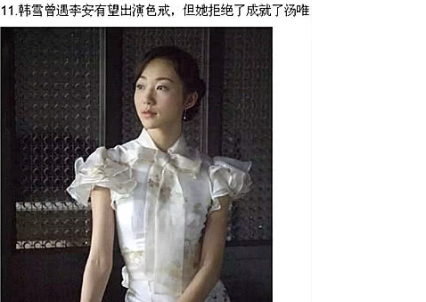 可就因为这些女星的拒绝,也成就了汤唯的成名之路;毕竟每一个女星都有各自的目标和演艺之路,而反观韩雪,在出道不久就已经备受关注,还是当时的圈内知名小花,而在07年更是上了央视春晚,要知道在过去那个娱乐圈,上春晚还是有各种条条框框的!而对于网友曝料的,韩雪拒绝李安不出演《色戒》也是有她的个人准则;同时,对于该爆料未证实是真还是假,我们也是要谨慎看待,毕竟如今网络上有不少谣言和不实传闻!