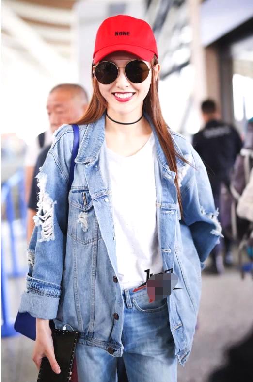 现身机场的唐嫣,身穿一件牛仔外套内搭白色T恤,下半身穿蓝色破洞牛仔长裤,肩背宝蓝色手袋,头戴一顶红色棒球帽十分抢眼呢,点亮整体,给整体加分呀。