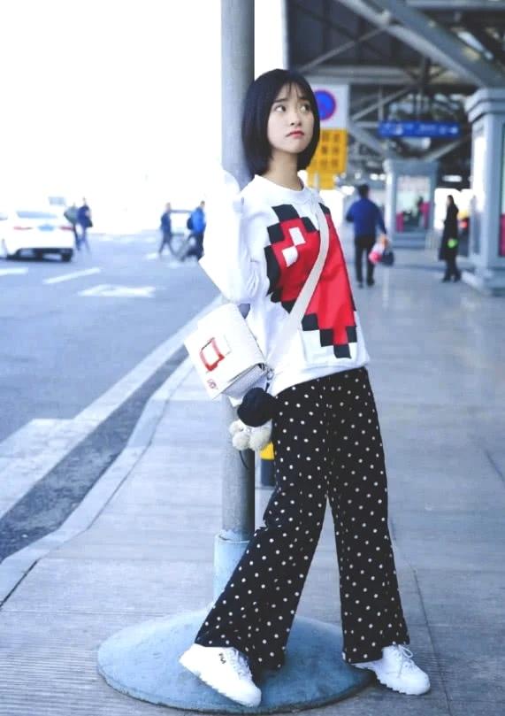 现身机场的沈月,身穿一款印有爱心图案的白色长袖搭配波点阔腿裤,搭配百搭小白鞋,这样经典的黑白搭配真是怎样都不会出错呀,整体造型尽显少女模样呀。