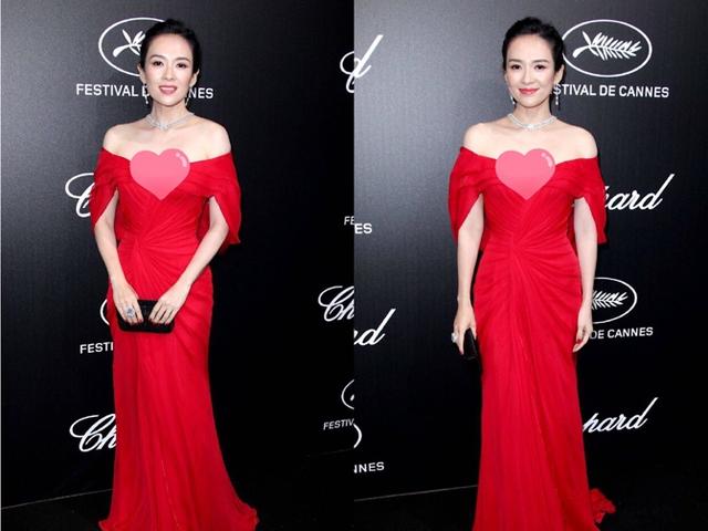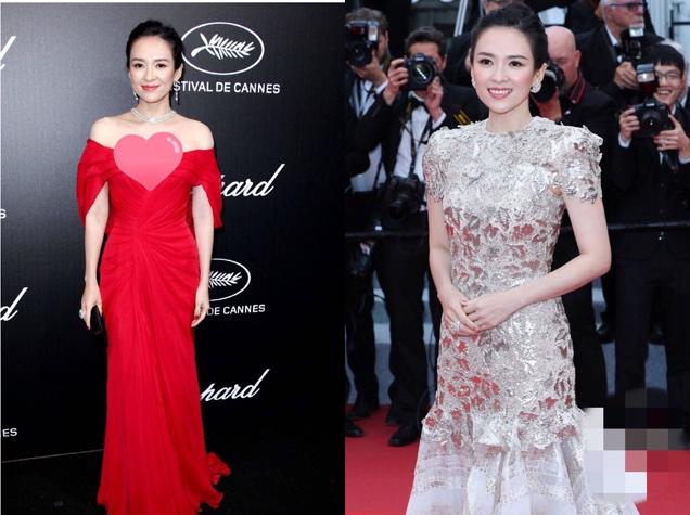 同一天晚上的晚宴章子怡以一身大红色的性感抹胸裙亮相萧邦戛纳联名酒会,可以说和白天的这套服装是完全不同的两种风格,但是章子怡都驾驭得非常的完美。