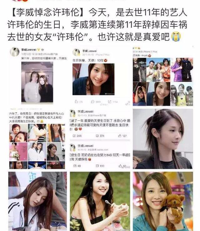 许玮伦去世后,每一年的11月13日李威都会以自己的方式悼念故人,从2007年到2018年,过去的11年每到许玮宁的冥诞日,李威总会写着“天使,生日快乐,我们想你”等诸如此类的文字。虽然年轻时李威处理恋情的方式对许玮伦造成过很大的伤害,但是能像他一样一直把许玮伦放在心底里的人,又有多少呢?这些年李威也谈过几任女朋友,甚至还一度和陶喆的前女友杨子晴有过沸沸扬扬的绯闻。