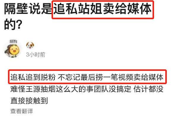 下午网曝称王源吸烟画面是被他的私生饭卖给媒体的,还表示:“脱粉前不忘最后捞一笔视频卖给媒体,难怪王源抽烟这么大的事团队没搞定,估计都没直接接触到”。