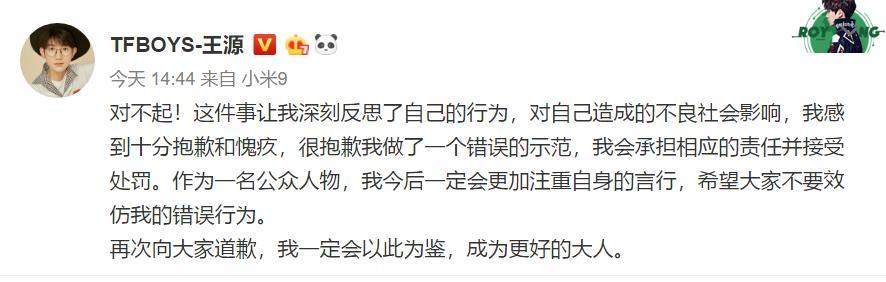 之后王源站出来回应道歉称:“对不起!这件事让我深刻反思了自己的行为,对自己造成的不良社会影响,我感到十分抱歉和愧疚,很抱歉我做了一个错误的示范,我会承担相应的责任并接受处罚。作为一名公众人物,我今后一定会更加注重自身的言行……”。