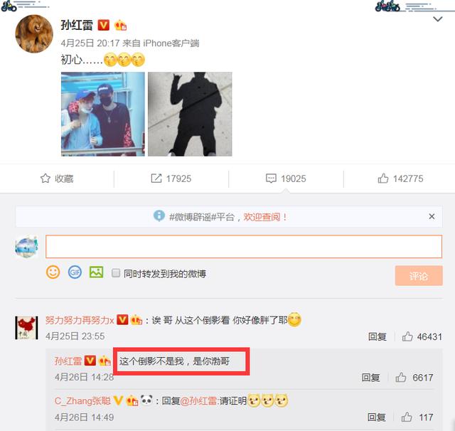 前段时间,因为孙红雷在微博上发了一张影子的照片,并且配文:初心。结果被张艺兴指出这个倒影看起来好像有点胖,孙红雷立马做出解释:这个倒影不是我,是你渤哥。