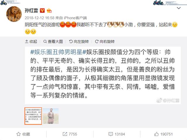 作为“颜王”,孙红雷对自己的长相尤其的在意,不仅在多档节目自称“孙漂亮”,还一直认为自己已经达到了颜值的巅峰,在面对网友不点名质疑的时候,往往都会转发文字,并且@黄渤。