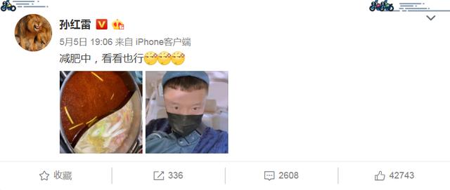 10天之后,孙红雷再发微博,配图中是一张火锅的照片和自己的一张高颜值自拍,配文:减肥中,看看也好!看来自己也发现,老甩锅给黄渤,对自己高颜值偶像形象不太好!