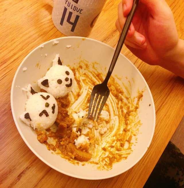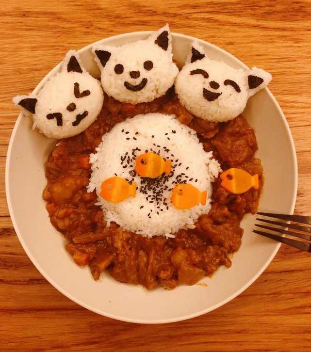张馨予的厨艺很不错,这道咖喱牛肉饭看上去很美味。成品出来之后,她还用米饭捏了三个可爱的猫咪头,每只猫咪神态各异,看上去非常可爱。