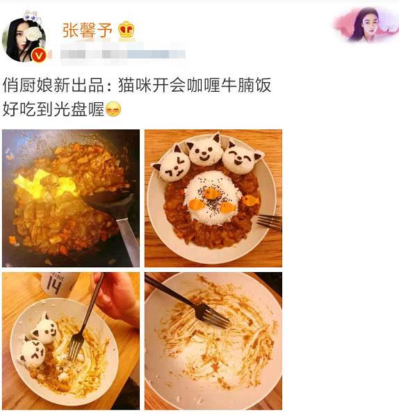 因为结婚生宝宝,张馨予近一年来都很低调,鲜少在公众面前露脸,不过她常在社交平台分享日常,以慰粉丝的相思之情。5月28日,张馨予在社交平台晒出自己做的饭菜,调侃自己是“俏厨娘”。