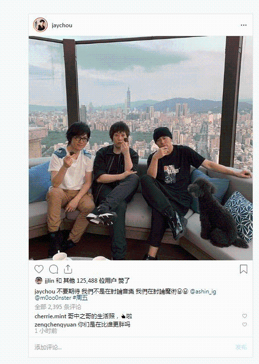 5月30日,周杰伦更新ins,这一次没有秀恩爱,晒出在台北家中与亚洲天团五月天阿信和怪兽的合照,周杰伦已经两三年没有发新专辑了,被歌迷一直催发新专辑,也许是被歌迷催怕了,周杰伦配文道:“不要期待,我们不是在讨论音乐,我们在讨论魔术。”