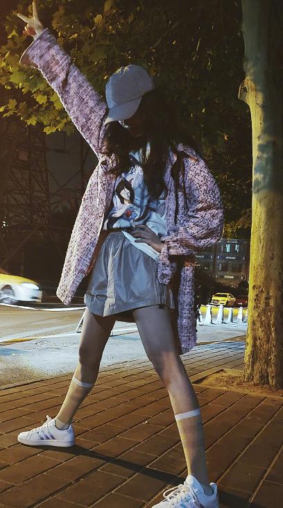 这张照片中,她满身少女系的穿搭,长筒袜小白鞋,T恤短裤鸭舌帽,粉丝系大大的bf风开衫,再配上高举的剪刀手——这哪里是33岁的妈妈,妥妥18岁。