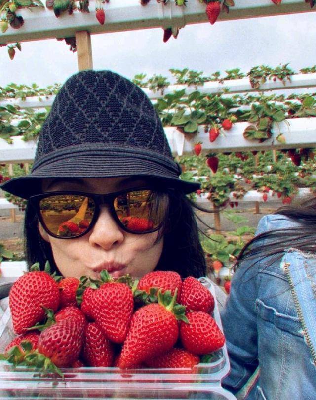 捧着一盒刚刚摘下来的新鲜草莓,满满的都是艳丽的红色,一看就很好吃啊,章子怡撅起嘴心情很好。