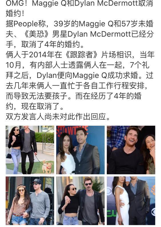 据外媒报道,39岁的Maggie Q疑似和男友分手,虽然双方还没有回应,但是知道这个消息小编还是感叹戏如人生,人生如戏。一直都觉得两个人很般配啊 未婚夫是57岁男星Dylan McDermott美恐里的男演员……相识这么久好不容易就要到走到婚姻了 最后还是各自安好了 所谓是相爱容易 相守难。据说是因为两人聚少离多造成,双方忙于工作,最终导致分手,