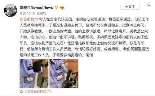 昨日下午,曾轶可在微博表示自己受到了首都机场人员的“刁难”,并且挂上了她所谓“刁难”她的机场人员的证件照,这一发就引发许多网友的热议,许多网友一开始都是站在曾轶可这边的。