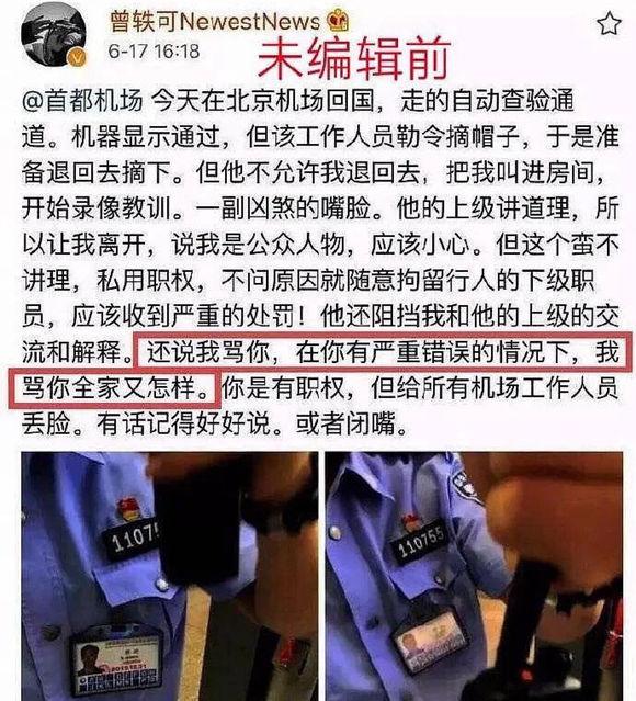 而且曾轶可还在微博里还表示需要通情达理的机场工作人员,不需要蛮横无理的。不过呢,这件事情很快就有网友发现,曾轶可编辑前的微博内容是说有辱骂工作人员的,并且还要骂工作人员全家。