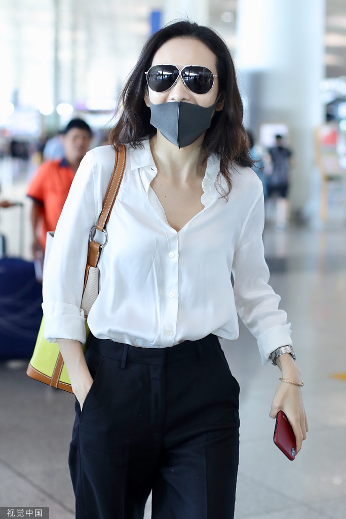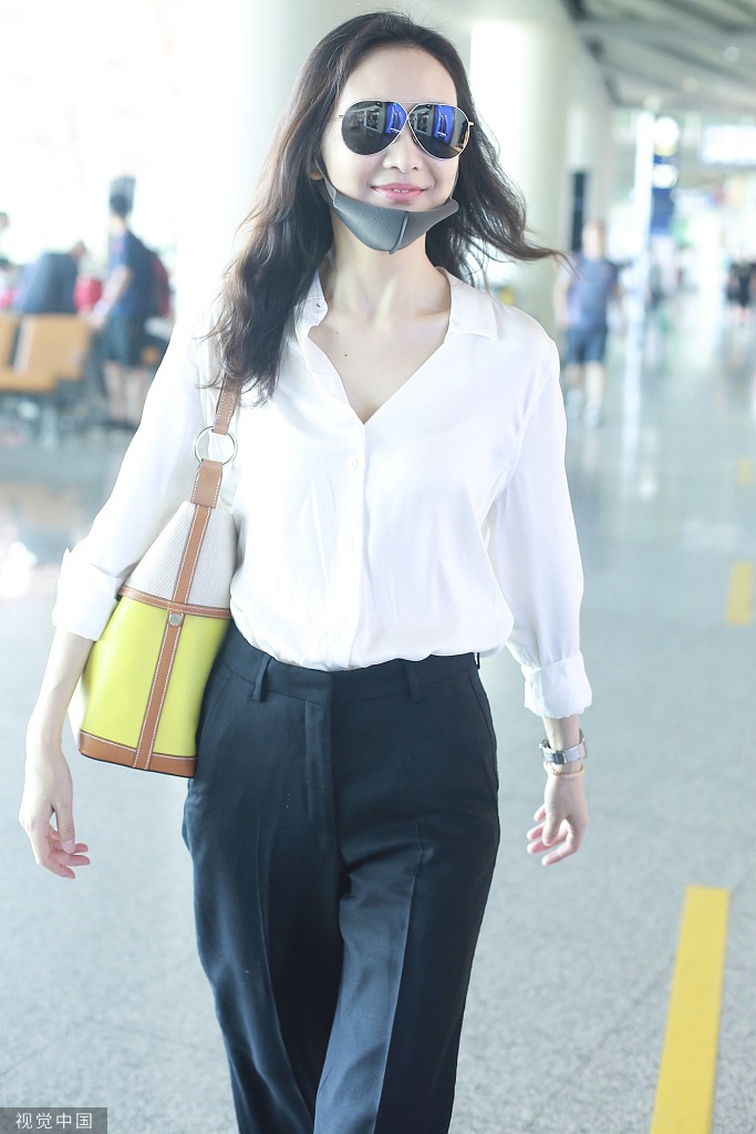 6月22日,王鸥现身首都机场。她穿白衬衫搭黑色宽松休闲裤,舒适悠闲,大步疾走御姐范十足,对镜挥手甜笑,亲和力max。(视觉中国/图)