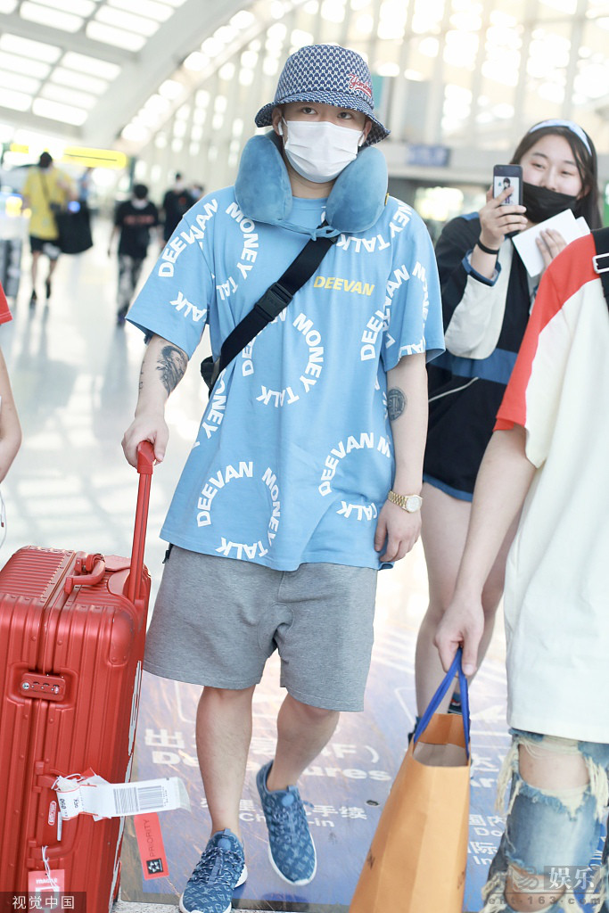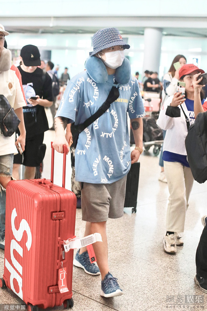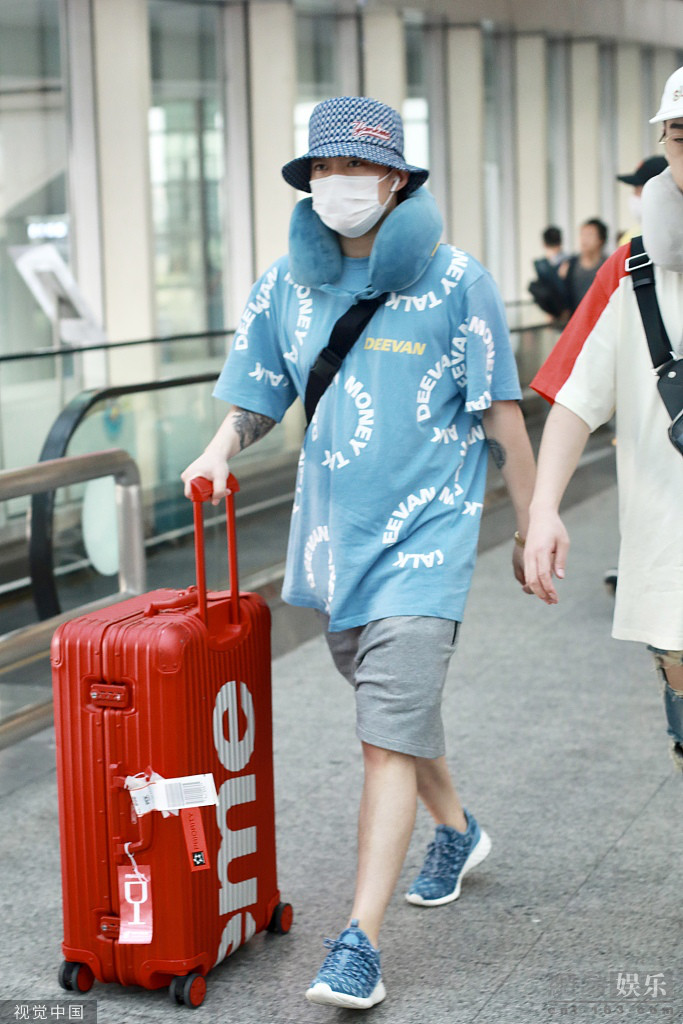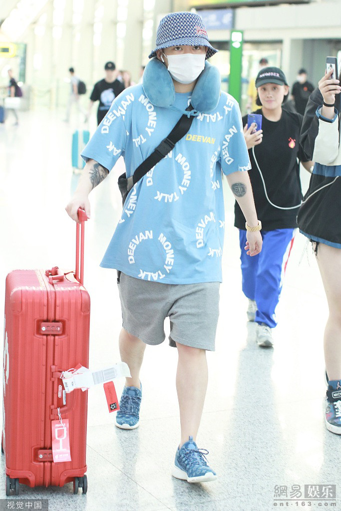 2019年6月24日,北京,PGone(王昊)现身机场。他口罩遮面头戴渔夫帽,遮挡的十分严实,身穿蓝色t恤与红色行李箱玩撞色。