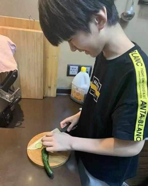 天天还是一如既往的西瓜头,皮肤白皙很是帅气,妥妥的一枚奶油小生,天天切黄瓜有模有样,自食其力,天天没有看镜头,但是也能看得出来,他笑得很开心。