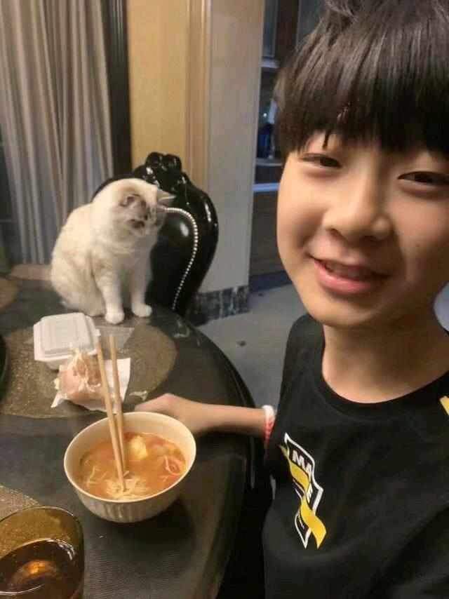 然后就是天天吃面条的照片,照片中天天的眼睛一单一双,不过好在丝毫不影响天天的颜值,还是一如既往的帅气,反正比张亮帅太多了!