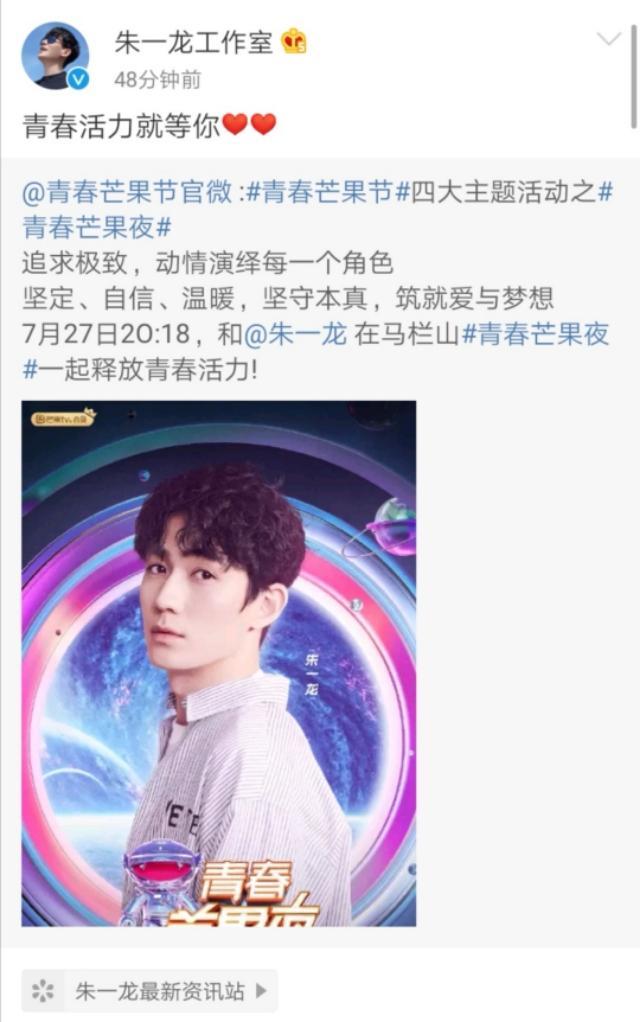 今日上午,青春芒果节官微,宣布朱一龙将参加青春芒果夜活动,7月27日晚八点十八分,马栏山一起释放青春活力!