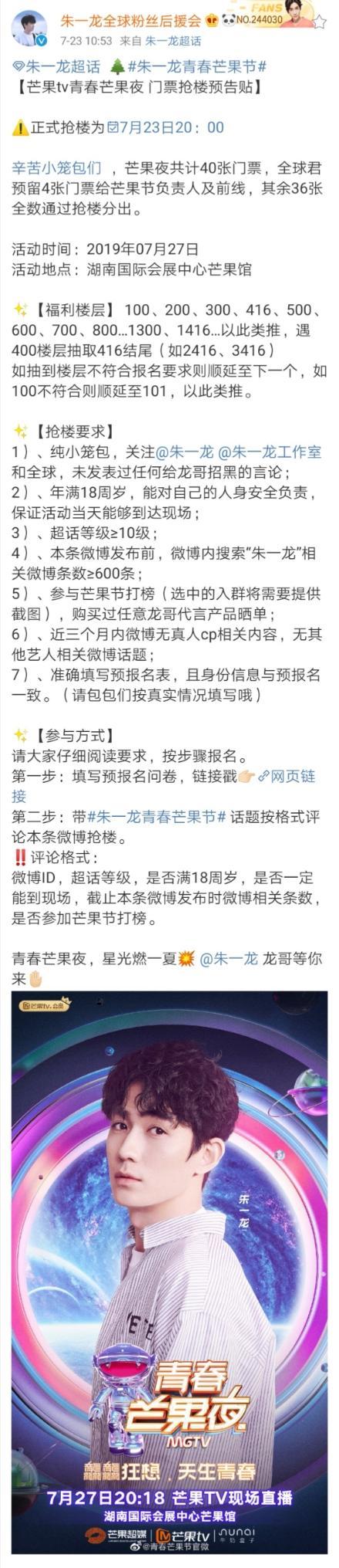 朱一龙全球后援会随后发布了芒果tv青春芒果夜,门票抢楼预告贴。想要去现场的粉丝可以关注一下,抢楼时间为7月23日,晚上八点,具体要求见图。此次活动时间为2019年7月27日,地点在湖南国际会展中心芒果馆。