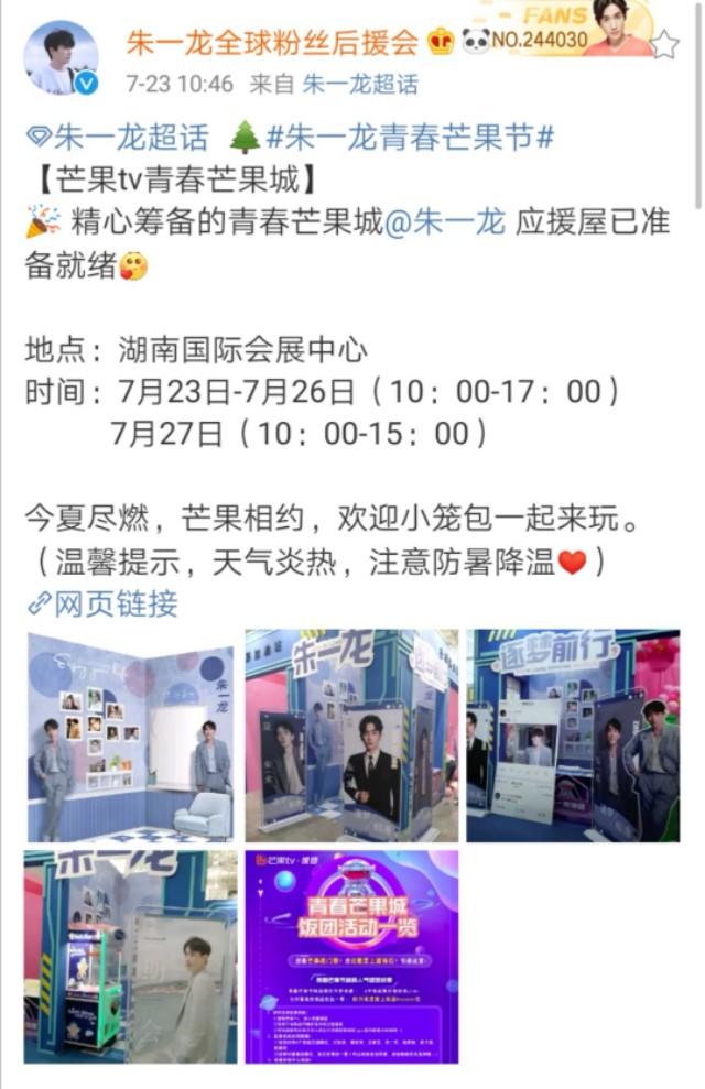 与此同时,芒果tv青春芒果城,朱一龙应援屋已准备好了,湖南的粉丝们可以去逛逛,但注意防暑降温。