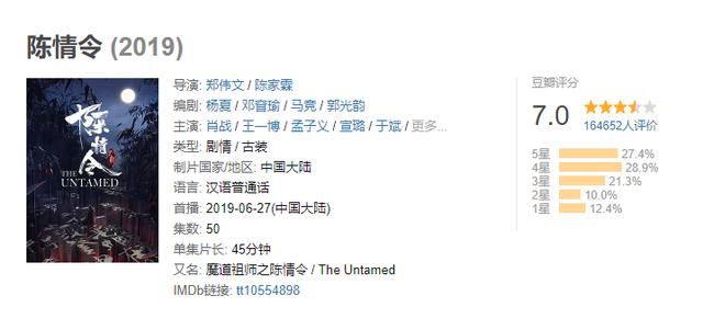 但即便做不到爆火,《陈情令》这部剧在播出一来网络上先关话题的搜索量也足以让它出圈了,豆瓣平台也从最初的4.9分上升至7.0分,能去的这么好的成绩也实属不易。而且,目前阿令剧情也正值关键时刻,相信随着故事情节的层层递进,也会吸引越来越多的观众眼球,网络评分或许也会持续上升。