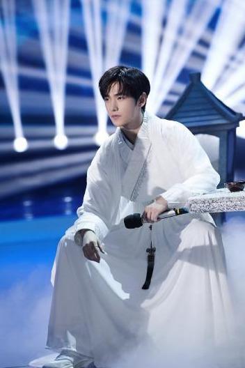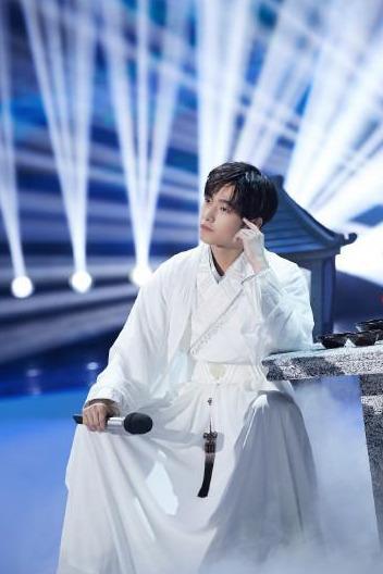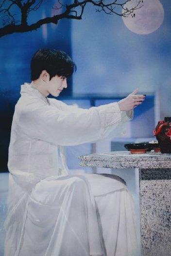 节目上杨洋着一身白衣轻微用手撑住自己的头部,作思考状,遥看远方。石头做的桌子上放着酒坛,和几个杯子。